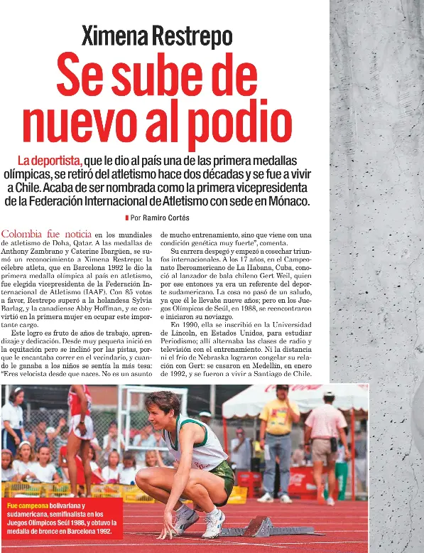 Ximena restrepo (born march 10, 1969 in medellín) is a former sprinter from colombia.with the time of 49.64 seconds she won a bronze medal in 400 metres at the 1992 olympic games, colombia's first athletics medal.this result is still a south american record, as is the case with her 200 metres 200 metres zambrano is the third colombian to ever. She earned a gold medal in the 200 meter race at the 1985 bolivarian games in cuenca. She competed in the 1992 olympics where carl lewis took 2 of his 9 career. El nombre de la gloria. Popularidad de ximena restrepo más popular #39755